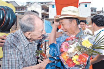 2005年8月18日,查尔斯·佐敦(左)再次来到东极岛和当年参加搭救的渔民沈阿桂重聚。