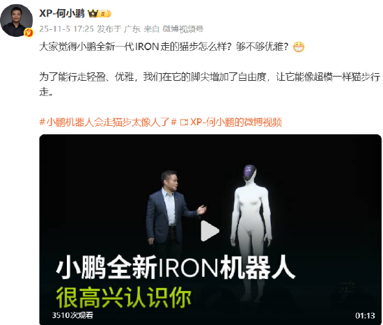 11月5日,在2025小鹏科技日活动上,小鹏汽车CEO何小鹏展示了小鹏全新一代IRON人形机器人走“猫步”。
