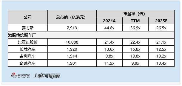 业绩疲软的同时,赛力斯的估值却仍处于高位。按当前港股2913亿港元市值(按发行规模测算),其2024年PE达44.8倍、TTM PE 36.9倍、2025年预测PE 26.5倍,不仅远超港股大市值传统主机厂平均水平(2024年14.2倍、TTM 14.7倍、2025年13.6倍)。其中,比亚迪作为行业龙头,2025年预测PE仅21.1倍;同为华为合作阵营的奇瑞汽车,2024年营业收入及净利润远超赛力斯,但2025年预测PE却仅10.4倍。这种“业绩增速低于预期与估值虚高”的失衡,使得赛力斯在港股市场缺乏吸引力,首日破发成为市场对其估值的“纠偏”。