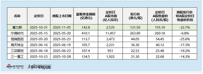早在招股阶段,赛力斯的高折价水平就引发市场对其估值的质疑,而最终确定的22.7%折价(发行价131.50港元/股,较10月31日A股收盘价155.19元/股计算),虽较最高预期略有收窄,但仍远超2025年同类大型A to H项目的常规水平——梳理今年发行规模100亿港元以上的A to H项目,除恒瑞医药因医药行业历史折价特性达25.6%外,其余项目折扣均控制在20%以内,宁德时代这类优质标的折扣更是低至6.8%。