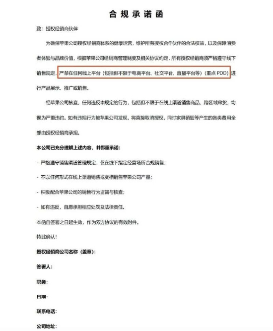 渠道方面,苹果近期也向下发通知称:要求所有线下授权经销商不得与任何电商平台合作,合规承诺函提到违规或将被取消授权。该举动也被外界视为苹果稳住价格与渠道秩序的有力举措。