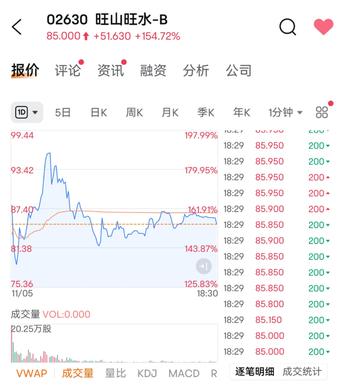 旺山旺水-B(02630.HK)将于明日(11月6日)在港交所挂牌上市。今日下午,在港股暗盘交易阶段,该公司的股价一度飙升至97港元/股,涨幅一度超过190%。富途数据显示,旺山旺水-B港股暗盘收盘报85港元/股,较招股价(33.37港元/股)上涨154.72%,若不计手续费,每手(200股)可赚1.03万港元。