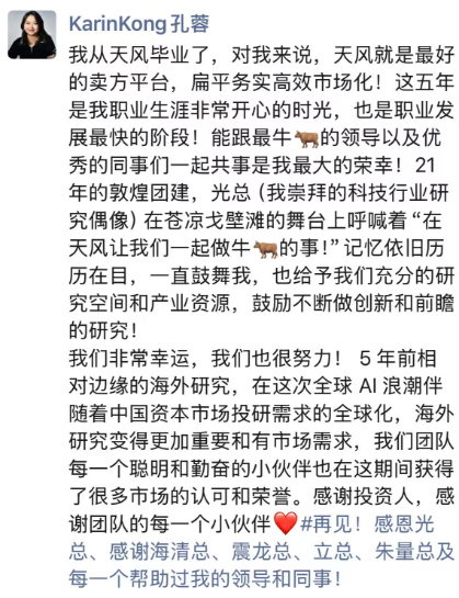 “我们非常幸运,我们也很努力!” 在正式加盟前夕,孔蓉在朋友圈发布的告别信中感慨道,“5年前相对边缘的海外研究,在这次全球 AI浪潮伴随着中国资本市场投研需求的全球化,海外研究变得更加重要和有市场需求。”
