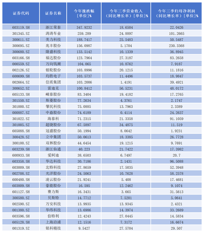 据览富财经统计,今年前三季度实现营业收入、归母净利润均同比增长,且截止10月31日收盘年内股价出现上涨的有32家上市公司。