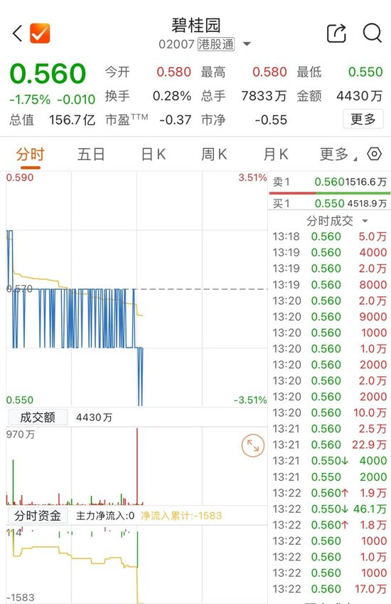 11月6日,碧桂园股价高开低走,截至发稿跌超1%,报0.56港元/股。