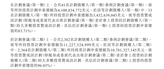 此次参与投票的债权人规模庞大,第一类计划债权人会议有41名债权人参与,投票债权总额达41亿美元;第二类计划债权人会议更是吸引了2382名债权人参与,债权总额约112.3亿美元。