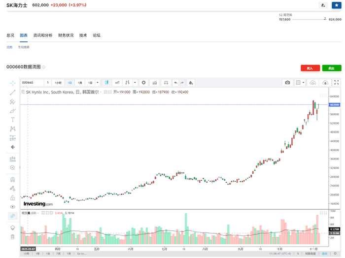 亮眼财报发布后,SK海力士股价一路走高。该股于11月3日创历史新高,截至11月5日收盘,年内累计涨幅达到232.95%,总市值飙升至2929亿美元。