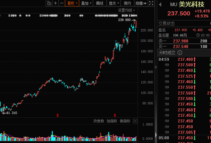 受HBM4提价影响,另一只全球存储巨头美光科技股价表现同样不俗。美股当地时间11月5日,美光科技大涨8.93%,最新股价报收237.5美元/股,创下历史新高,年内累计涨幅183.01%,总市值升至2665.86亿美元。
