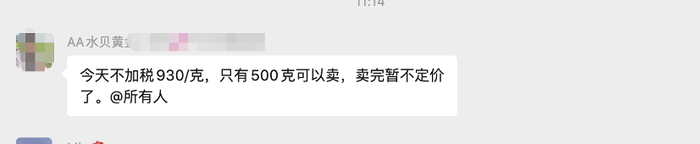 在一片“涨”声中,仍有部分商家为抢占客户,限量推出“免税额度”。一位中小商家表示,当日其店内不含税金价约为930元/克,但仅开放500克配额。“现在价格每天变动,全看料行供应,有料才能卖。”她称。