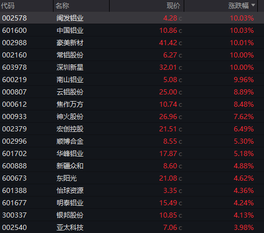 成份股方面,铝业龙头显著领涨,南山铝业涨停,中国铝业涨超4%,云铝股份、神火股份等个股跟涨。