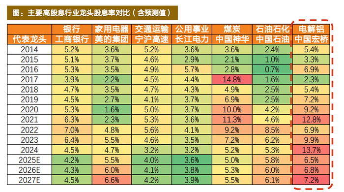 同时,天风证券也最新研报指出,传统周期行业电解铝已逐步转型为"上有价格弹性,下有分红支撑"的优质稀缺资产。截至2024年底,电解铝板块加权平均股息率高达6.0%,在主要高股息行业中位居首位,其中龙头中国宏桥股息率更是达到惊人的13.7%。
