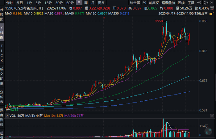 11月6日,有色金属板块延续强势表现,有色龙头ETF场内价格3.22%,日线2连阳。深交所数据显示,该ETF近4日连续吸金,合计金额2579万元。据Wind数据,有色龙头ETF年初迄今累计涨幅超70%。