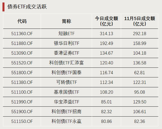 11月6日,ETF成交额合计4377.97亿元,较昨日减少超600亿元。具体来看,7只ETF成交额突破100亿元,短融ETF成交额为314.13亿元,在所有ETF中成交额最高。
