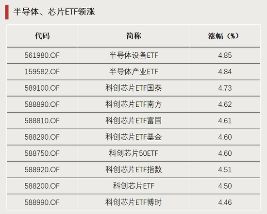 11月6日,科技股反弹,半导体产业链领涨。涨幅前十的ETF均为半导体、芯片相关ETF。其中,半导体设备ETF(561980)涨幅达4.85%,在全部ETF中涨幅最高;半导体产业ETF(159582)涨幅超过4.8%,8只科创芯片主题ETF涨幅均超4%。