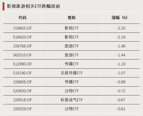 影视、传媒、旅游相关ETF今日跌幅居前,两只影视ETF跌幅均超2%。此外,三只跨境ETF进入跌幅榜前十。