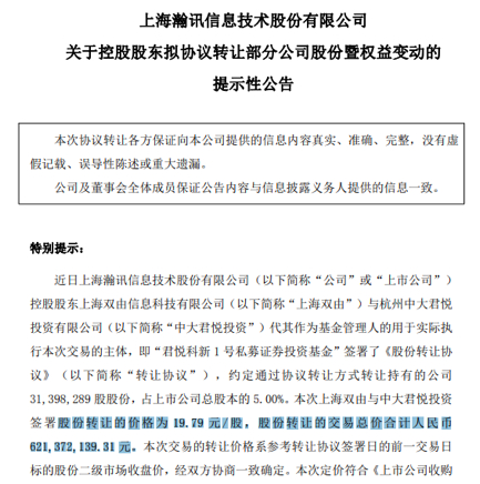11月6日晚,上海瀚讯公告称,公司控股股东上海双由信息科技有限公司(简称“上海双由”)与杭州中大君悦投资有限公司(简称“中大君悦投资”)签署了《股份转让协议》。上海双由拟将其持有的公司约3139.83万股股份(占上市公司总股本的5%),以19.79元/股的价格转让给后者,交易总价约6.21亿元。