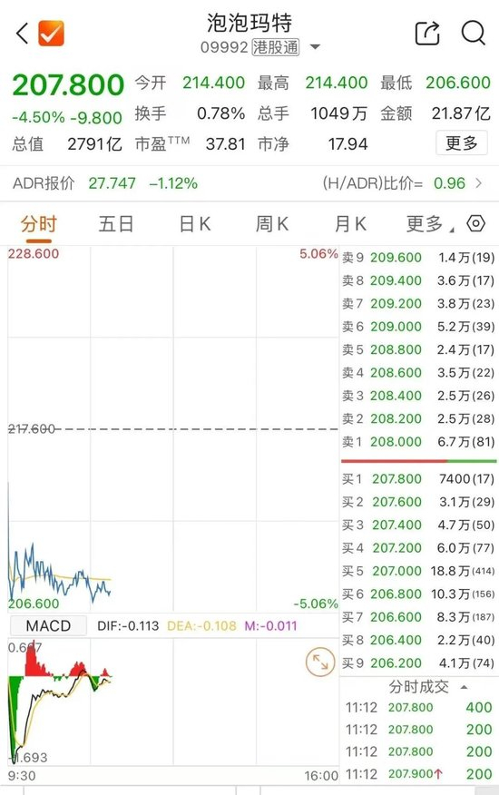 截至发稿,泡泡玛特港股跌超4%,报207.8港元/股。
