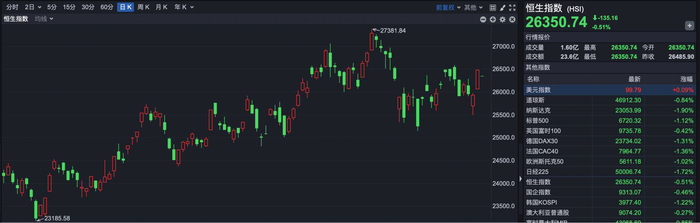 截至发稿,恒生指数报26350点,下跌135点,跌幅0.51%。