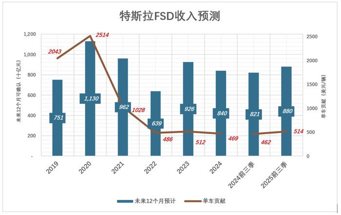 2019年,与FSD相关的递延收入增加8.8亿美元,减去确认营收的3亿美元,年末账面值14.7亿美元。这一年,每卖一辆车,与FSD相关的递延收入增加2393美元;