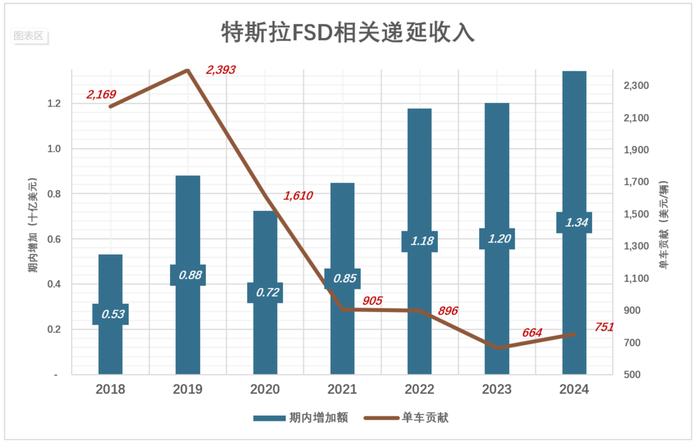 大幅降价后,2024年递延收入增加13.4亿美元,每卖一辆车与FSD相关的递延收入增长751美元。