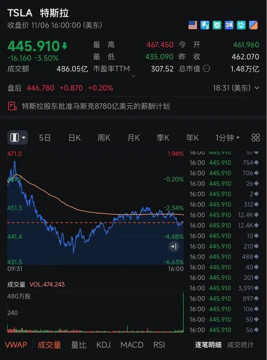 个股方面,特斯拉跌逾3%。当日,特斯拉召开年度股东大会,特斯拉股东批准马斯克的1万亿美元薪酬计划,超过75%的股东批准,支持他将公司转变为人工智能和机器人巨头的愿景。