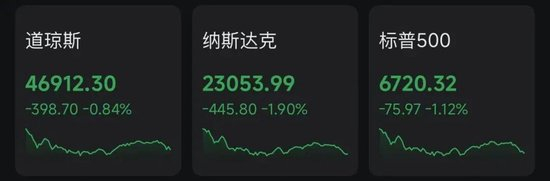 美股市场遭遇“黑色星期四”。当地时间11月6日,美股三大指数集体收跌,截至收盘,道指跌0.84%,报46912.30点;纳指跌1.90%,报23053.99点;标普500指数跌1.12%,报6720.32点。