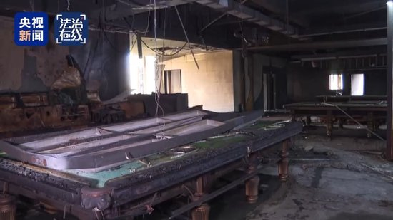 记者沿着楼梯上楼发现,防火门敞开的楼梯间均被浓烟熏黑,处于闲置的地上1层至4层也不同程度过火,5层台球室的多处台球桌上堆积着坠落物,部分墙面、屋顶面被高温烘烤脱落,木质结构的门框、匾牌均烧损炭化,摆放在一旁的绿植也未能幸免,记者发现,离出口处越近的区域受损就越严重,包间、厨房和杂物间均不同程度过火。