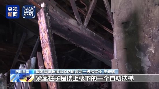 国家消防救援局消防监督司一级指挥长 王天瑞:工人在切割自动扶梯的作业点,刚好又在孔洞的上方,大量高温熔渣顺着孔洞直接掉落在了小仓库柱子旁边的衣物、纸张等可燃物上面,火焰顺着这根柱子迅速向四周蔓延扩大成灾。