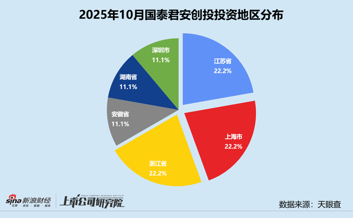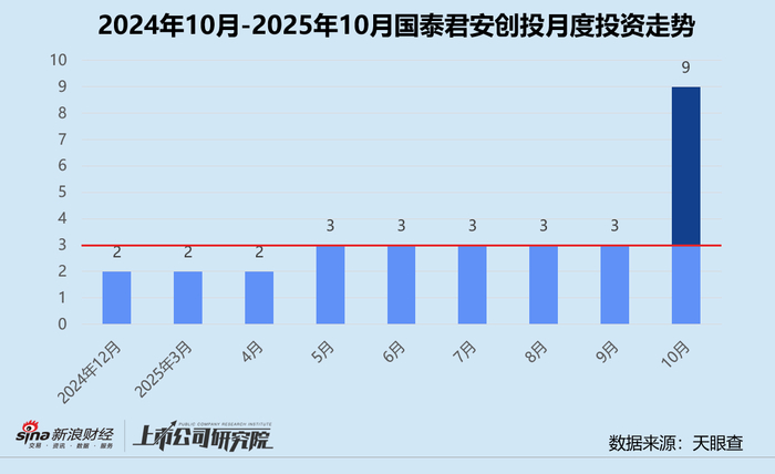 统计区间内,国泰君安创投公开披露的股权投资事件共9起,创下自2024年12月以来新高。往期数据显示,国泰君安创投在今年9月之前,整体投资节奏平缓,月均投资事件数长期稳定在2-3起,10月呈“爆发式”增长。