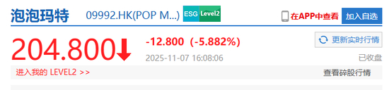 11月7日,泡泡玛特股价大幅走低,截至收盘跌5.882%。