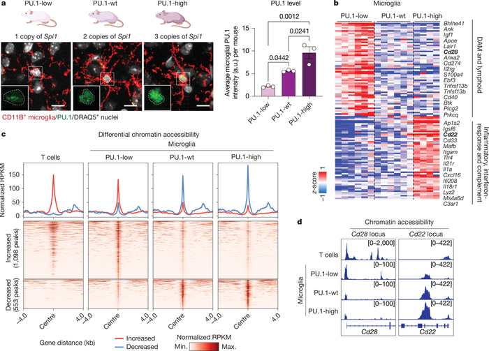 PU.1 水平的降低会进一步激活一种名为 CD28 的分子,最终将小胶质细胞“切换”到一种具备强大神经保护能力的模式。