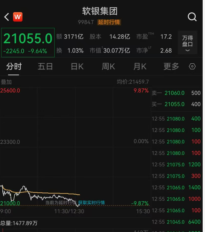 11月7日软银集团股价大跌,截至发稿,跌幅为9.64%,目前总市值30万亿日元(约合人民币1.4万亿元)。