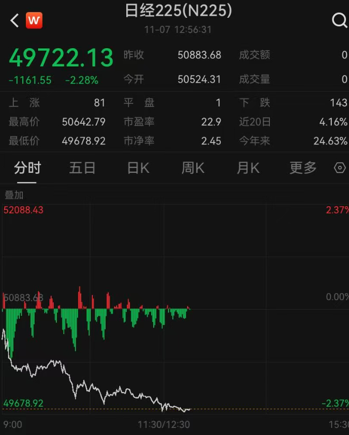 日经225指数跌破50000点关口,截至发稿,跌幅超2%。
