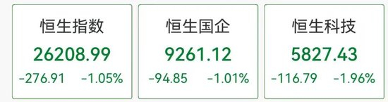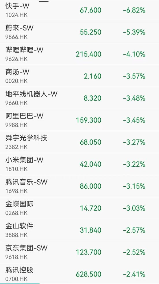权重科技股集体弱势,快手-W跌近7%,蔚来-SW跌超5%,小米集团-W、阿里巴巴-W跌超3%,美团-W、京东集团-SW、腾讯控股跌超2%。