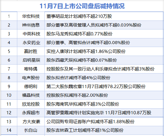 据统计,11月7日,盘后江苏有线披露增持情况。华宏科技、神州信息、中英科技、永安药业、赢时胜、启明星辰、唯特偶、电声股份、德明利、福晶科技、欣龙控股、永辉超市、方大炭素、长白山等14家上市公司披露减持情况。