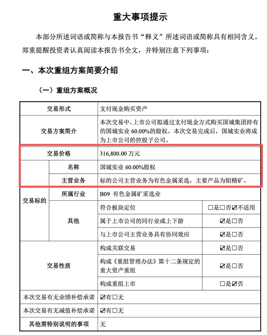 成立于2005年的国城实业,注册资金10.5亿元,主营业务为有色金属采选,目前在产矿山为内蒙古卓资县大苏计钼矿,钼原矿石经过破碎、研磨及浮选后产出钼精矿,钼精矿为标的公司主要产品。
