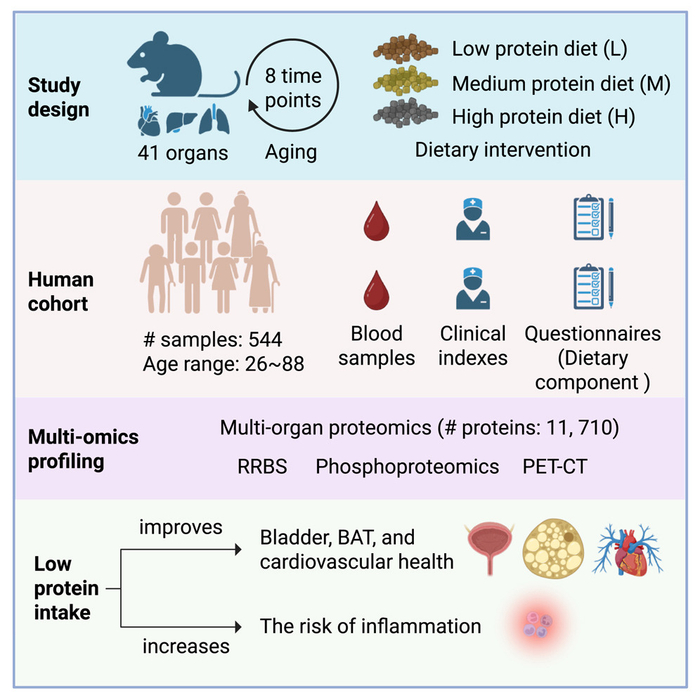 研究中,该团队首次绘制出覆盖小鼠全身 41 个器官的衰老与饮食干预的蛋白质组图谱,实验结果显示限制蛋白质摄入可能具有延缓衰老的潜力。实验中,中年雄鼠对蛋白质限制最为敏感,表现出最显著的进食量、体重及脂肪功能改善,这提示着中年或是最佳干预窗口期。