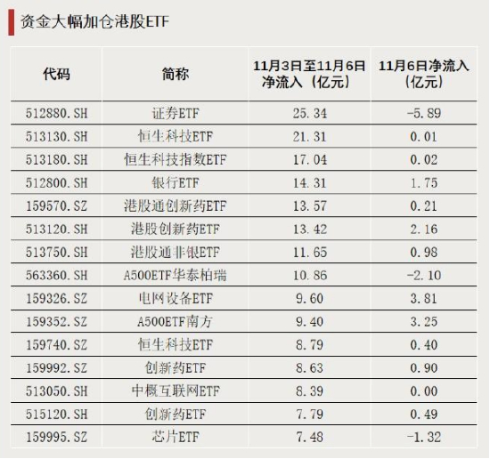 11月3日至11月6日,多只港股ETF资金净流入居前,恒生科技、港股创新药等ETF被大量加仓。