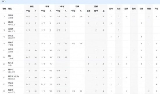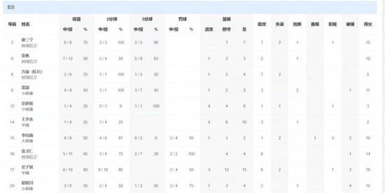 北京队方面,范子铭18分15篮板6助攻,张帆19分3篮板2助攻,廖三宁15分7篮板7助攻,张才仁14分4篮板6助攻。