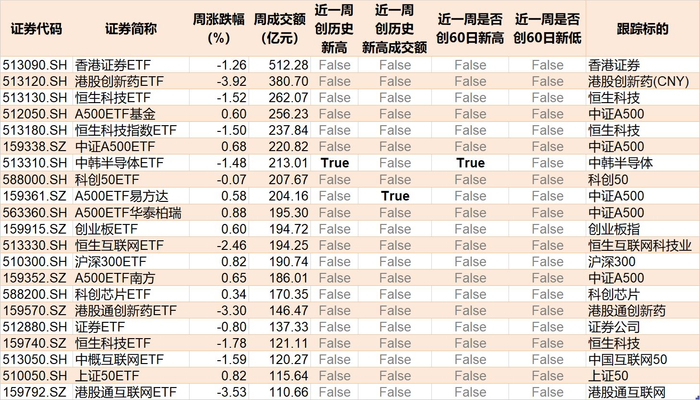 另外,本周中韩半导体ETF创历史新高,A500ETF易方达成交额创历史新高。