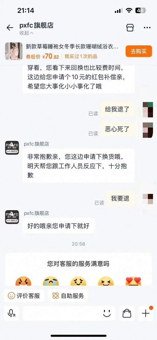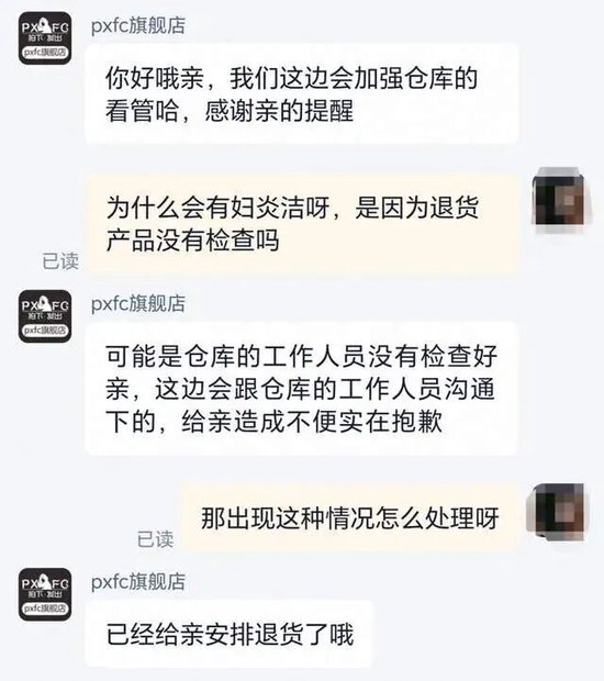 随后,记者就此事通过平台联系上“pxfc旗舰店”,店铺客服表示,已为祝女士的订单进行退货处理,称问题根源可能是仓库工作人员检查不到位。“这边会跟仓库的工作人员沟通,加强仓库看管。”当记者询问涉事睡袍最后会如何处理,是否会再次销售时,店铺客服已读却并未进行回复。